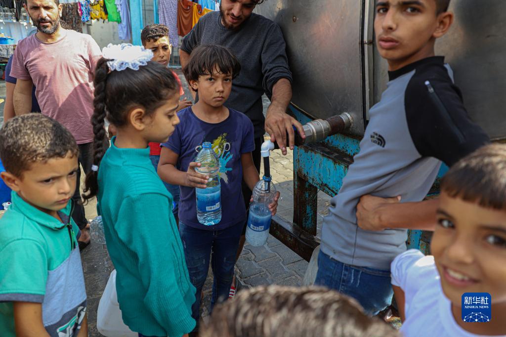 10月22日,兒童在加沙地帶南部城市汗尤尼斯一所臨時(shí)收容學(xué)校內(nèi)取水。