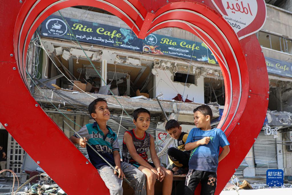 10月22日,在加沙地帶南部城市汗尤尼斯,幾名兒童坐在一處心型設施上,身后是遭以色列空襲損毀的建筑。