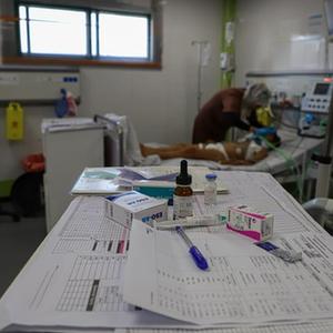 10月22日,在加沙地帶南部城市汗尤尼斯的納賽爾醫院,醫務人員救治在以色列空襲中受傷的兒童。