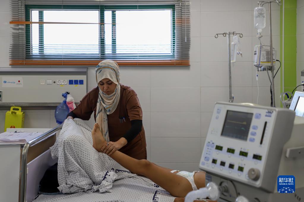 10月22日,在加沙地帶南部城市汗尤尼斯的納賽爾醫(yī)院,醫(yī)務(wù)人員救治在以色列空襲中受傷的兒童。