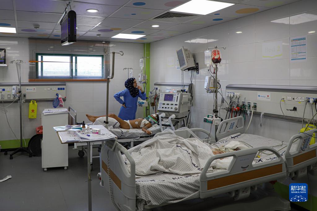 10月22日,在加沙地帶南部城市汗尤尼斯的納賽爾醫院,醫務人員救治在以色列空襲中受傷的兒童。