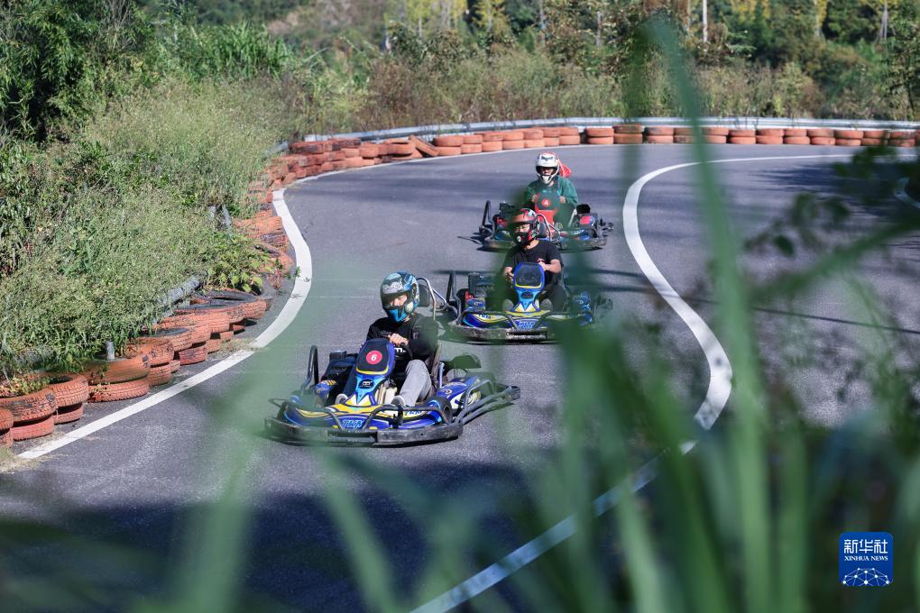 10月23日,游客在建德市楊村橋鎮嶺源樂活島休閑基地體驗卡丁車。