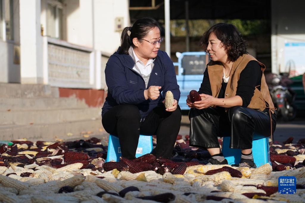 在北京市平谷區北臺頭村村委會,王翠云(右)與北京市農林科學院玉米研究所王榮煥研究員交流玉米知識(10月19日攝)。