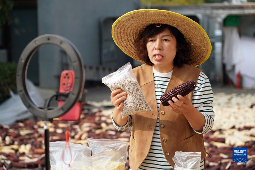 在北京市平谷區北臺頭村村委會,王翠云通過視頻直播銷售玉米產品(10月23日攝)。