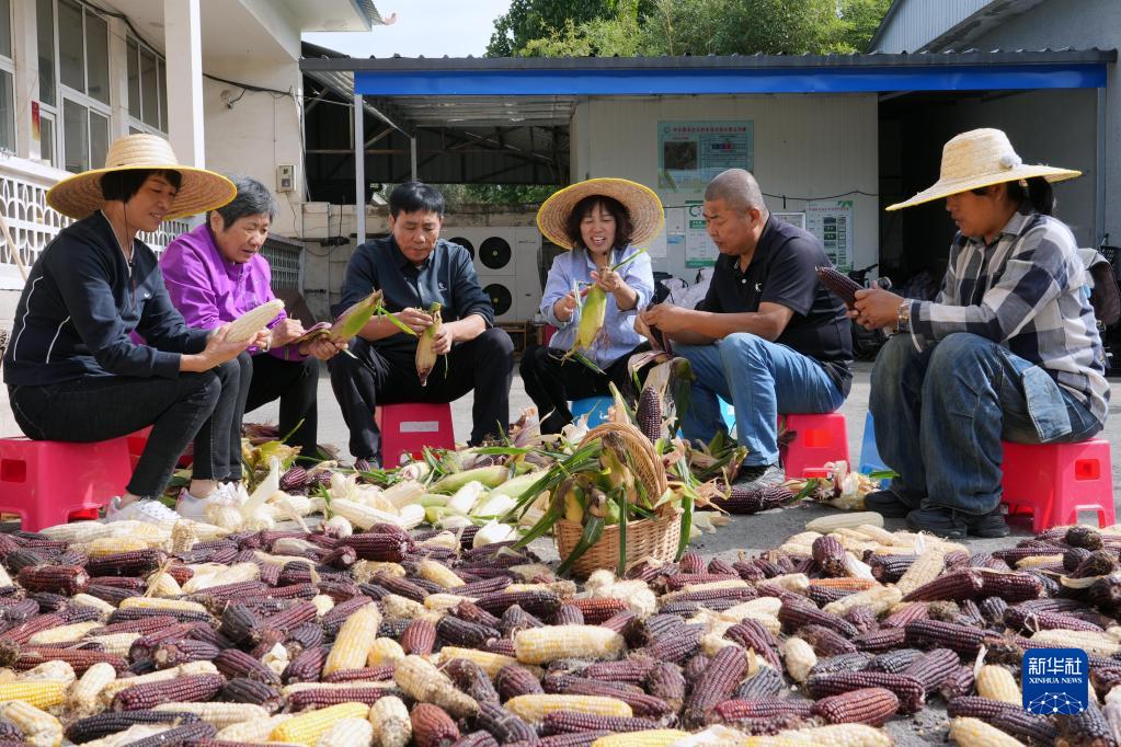 在北京市平谷區北臺頭村村委會,王翠云(右三)與村民一起剝玉米(10月4日攝)。