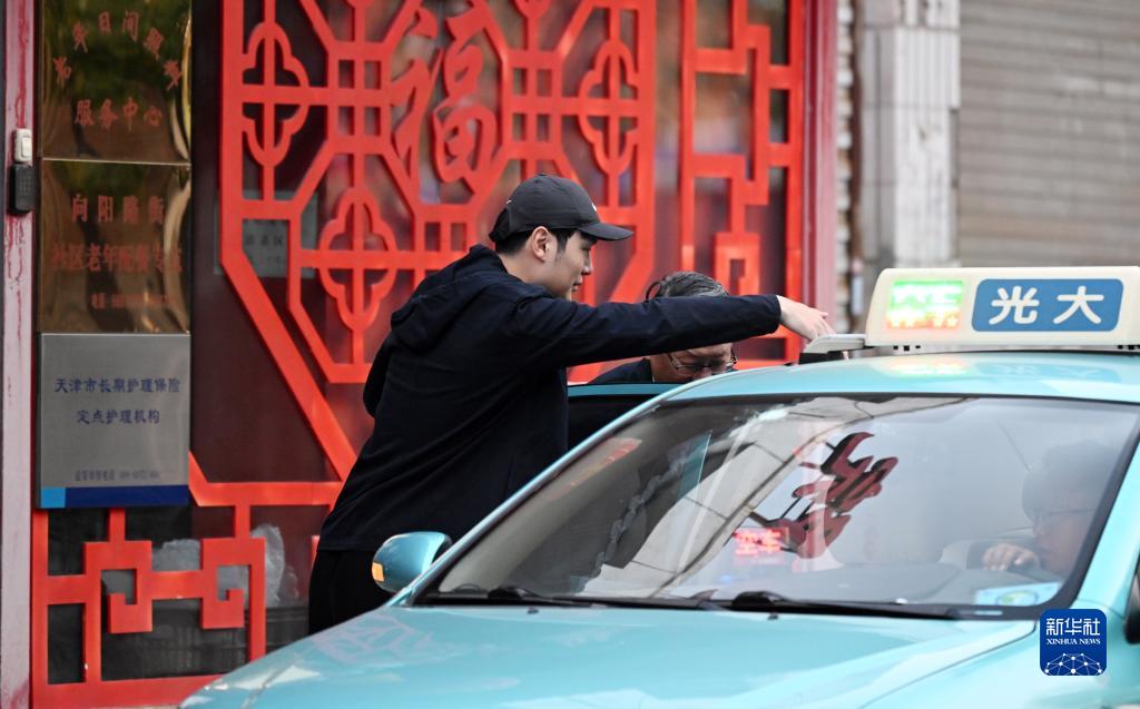 在靜雅老人院門口,陳卓照顧老人上車(10月21日攝)。