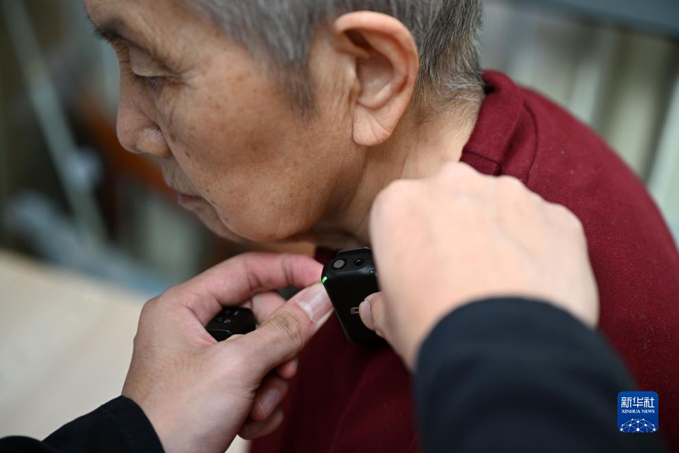 10月20日,在靜雅老人院,陳卓為一位老人別上麥克風準備拍攝短視頻。