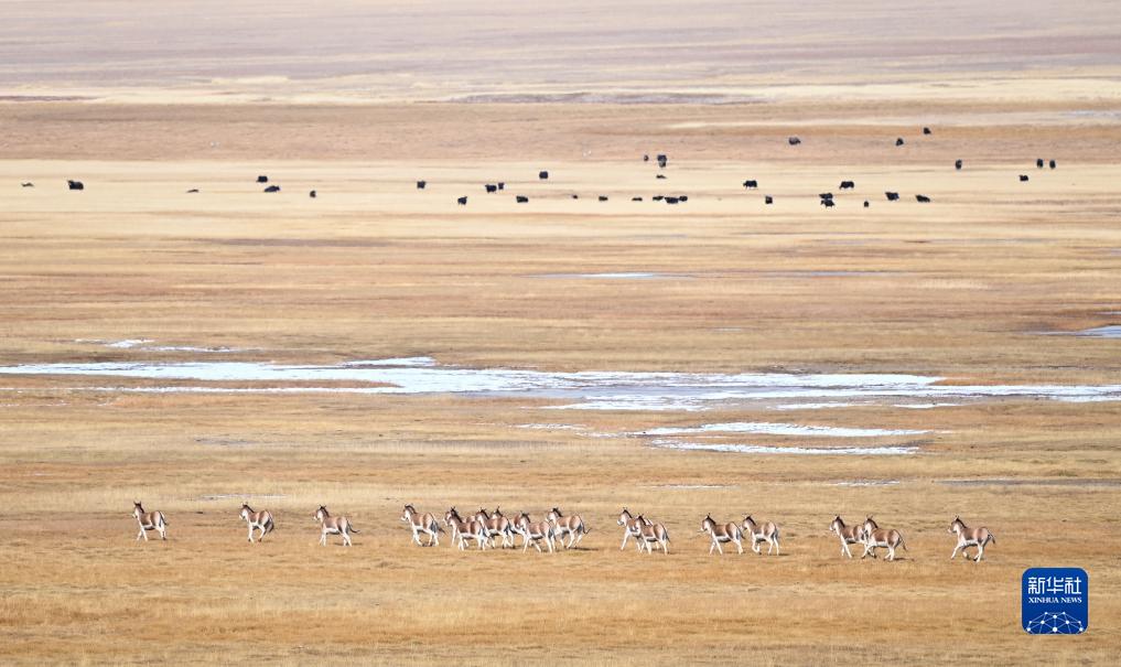 10月16日在阿爾金山國家級自然保護(hù)區(qū)拍攝的藏野驢和野牦牛。