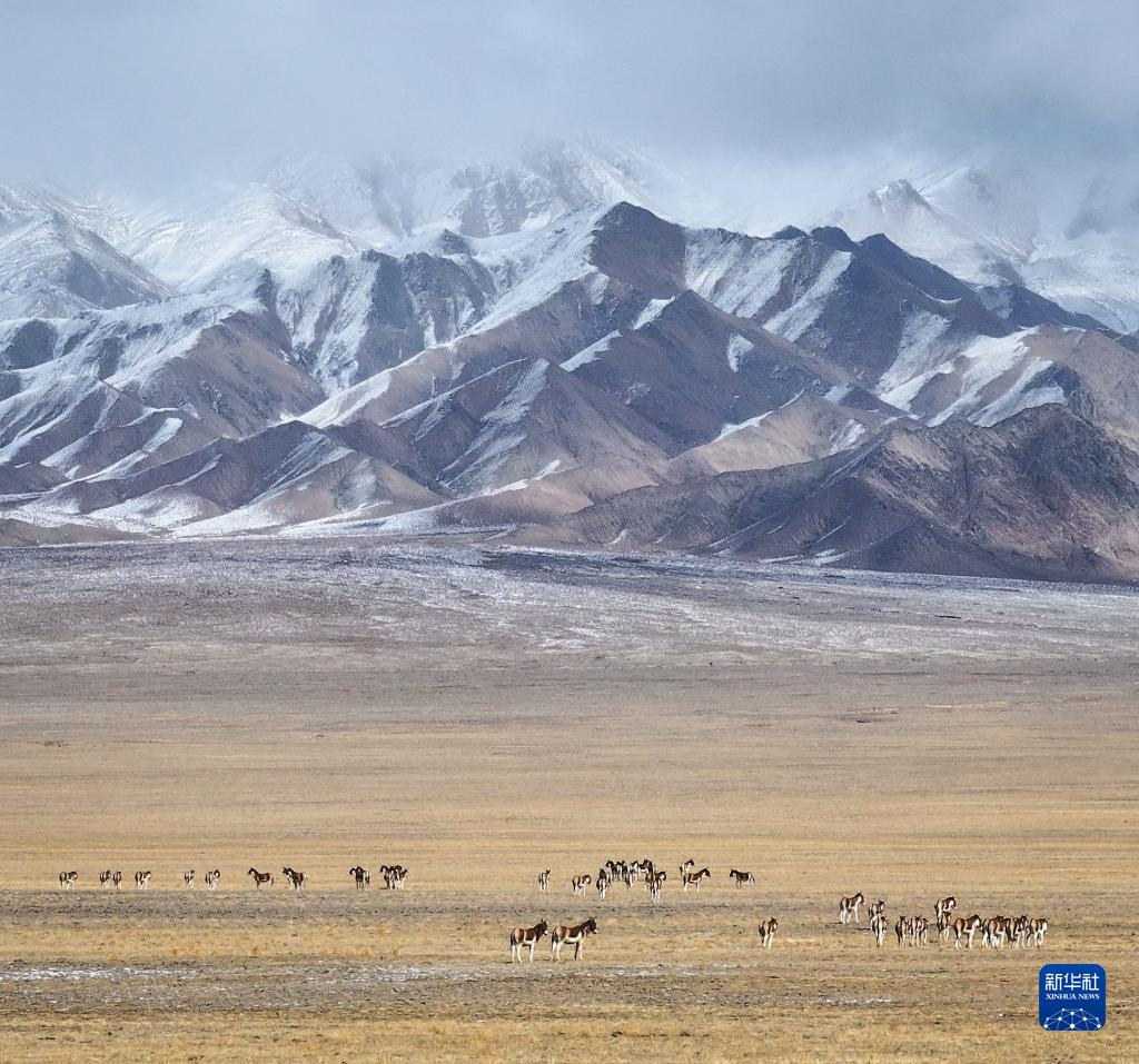 10月16日,在阿爾金山國家級自然保護區,藏野驢在草原上覓食(無人機照片)。