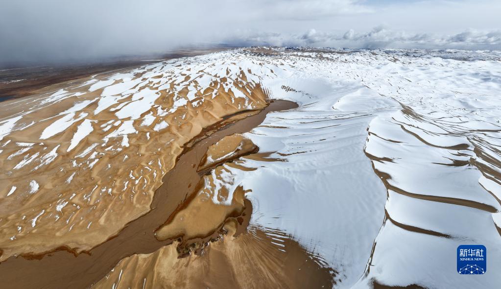 10月16日在阿爾金山國家級自然保護區拍攝的白雪覆蓋的大沙子泉(無人機全景照片)。