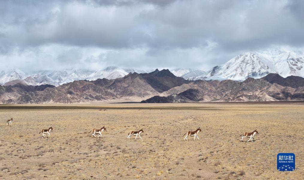 10月17日,在阿爾金山國家級(jí)自然保護(hù)區(qū),藏野驢在草原上奔跑(無人機(jī)照片)。