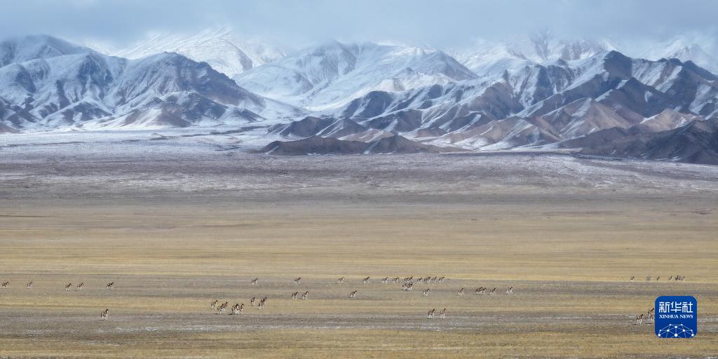 10月16日,在阿爾金山國家級自然保護區(qū),藏野驢在草原上覓食(無人機照片)。