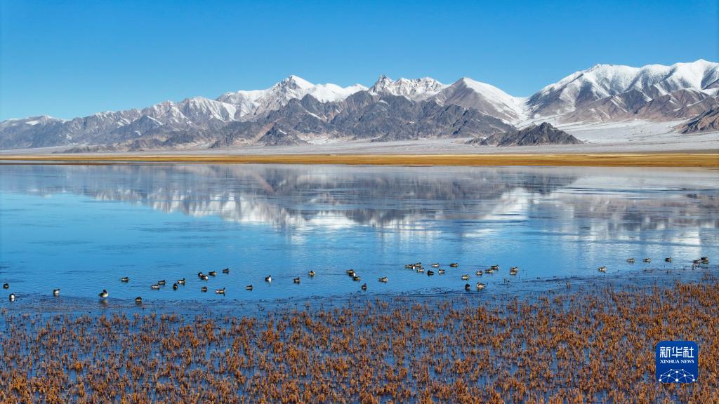 10月18日,在阿爾金山國家級自然保護區,針尾鴨等水鳥在依協克帕提湖棲息(無人機照片)。