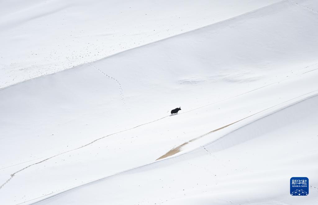 10月16日,在阿爾金山國家級自然保護區,野牦牛攀爬雪后的庫木庫里沙漠。