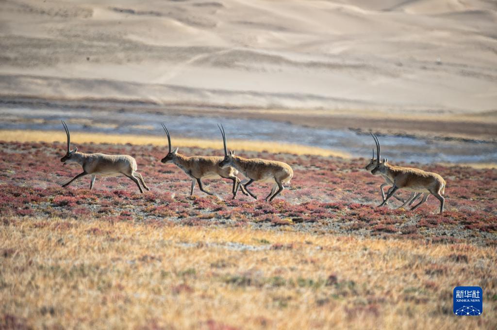 10月13日在阿爾金山國(guó)家級(jí)自然保護(hù)區(qū)拍攝的一群奔跑的藏羚。