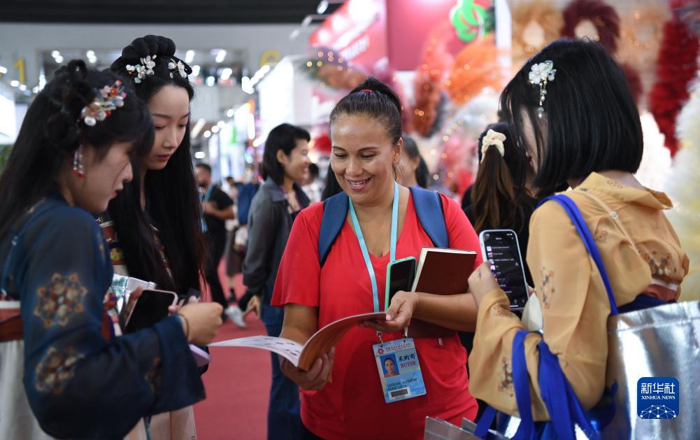 10月23日,外國采購商(中)與參展商工作人員洽談。