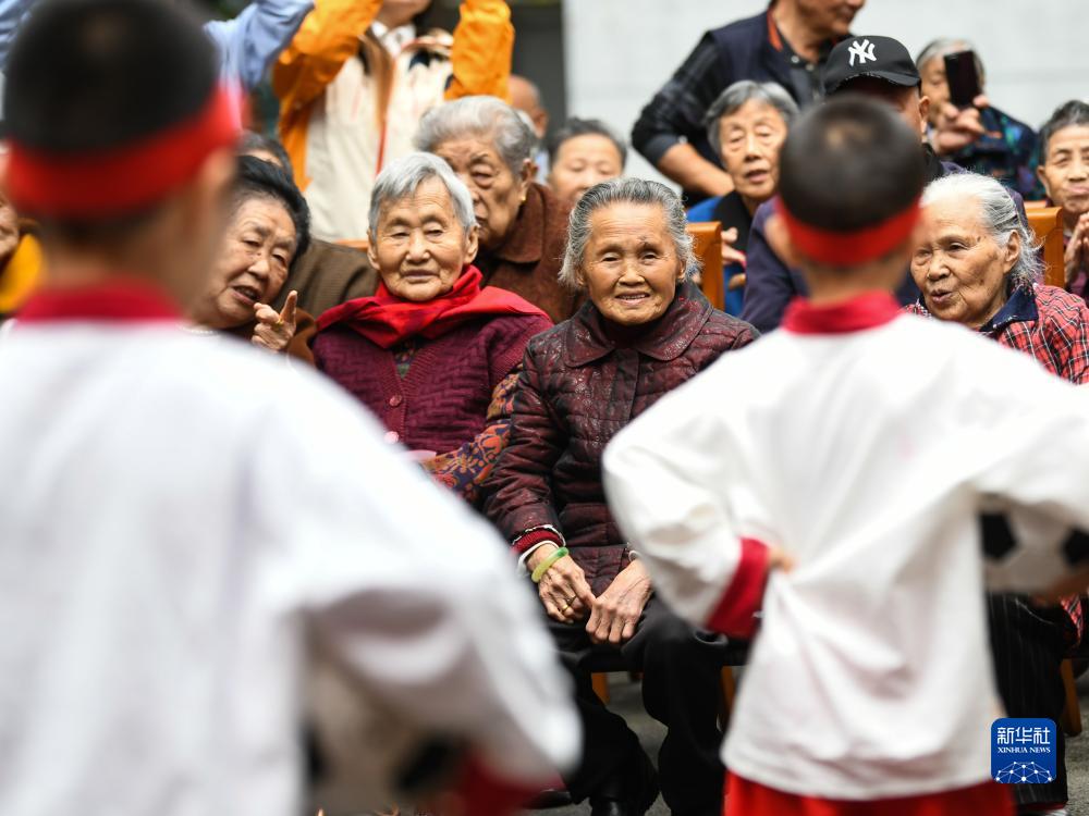 10月20日,在四川省眉山市彭山區社會福利院,趙鳳章老奶奶(后右二)在觀看彭山區幼兒園的小朋友表演的節目。