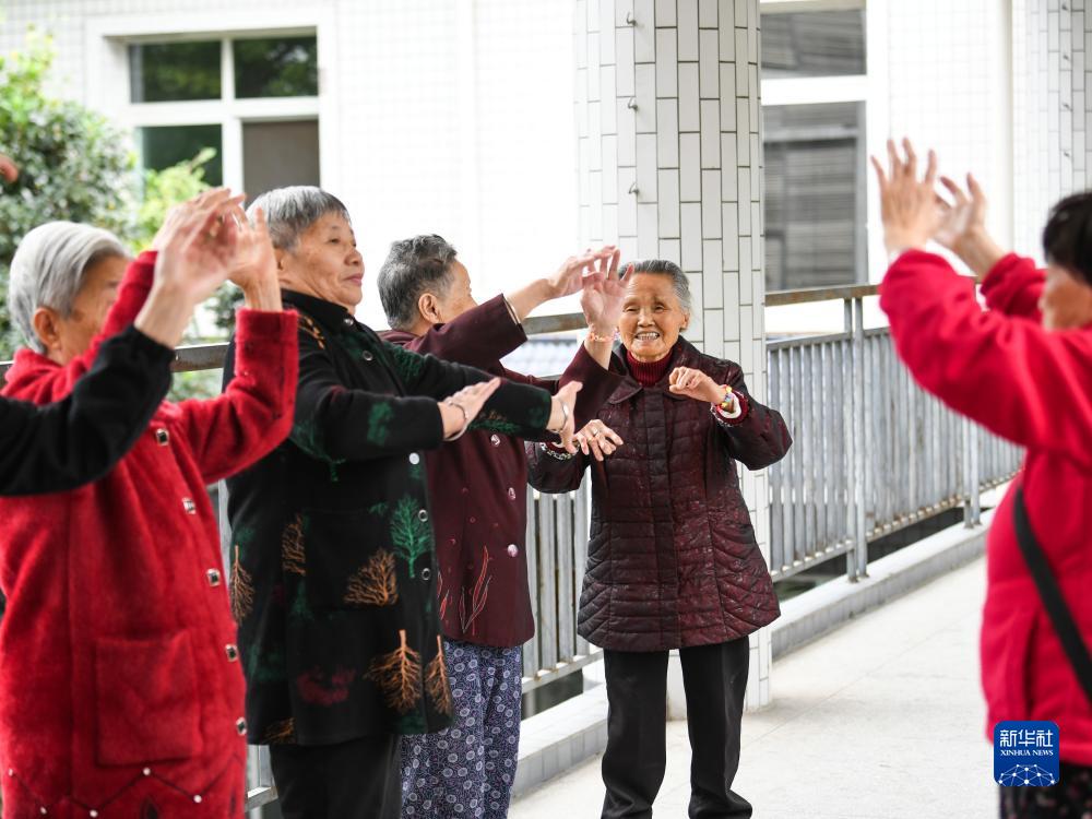 10月20日,在四川省眉山市彭山區(qū)社會福利院,趙鳳章老奶奶(右二)和福利院其他老人一起學做手指操。