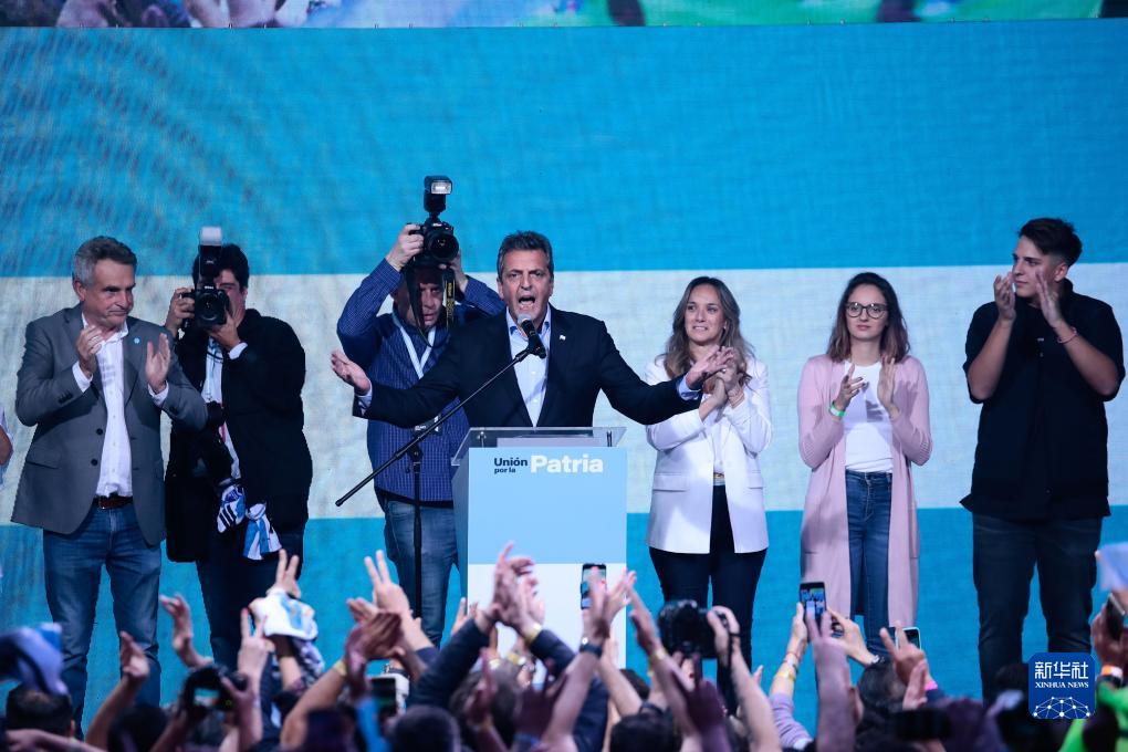 10月22日,阿根廷中左翼執(zhí)政聯(lián)盟祖國聯(lián)盟候選人、現(xiàn)任經(jīng)濟部長塞爾希奧·馬薩(中)在位于首都布宜諾斯艾利斯的競選總部發(fā)表演說。
