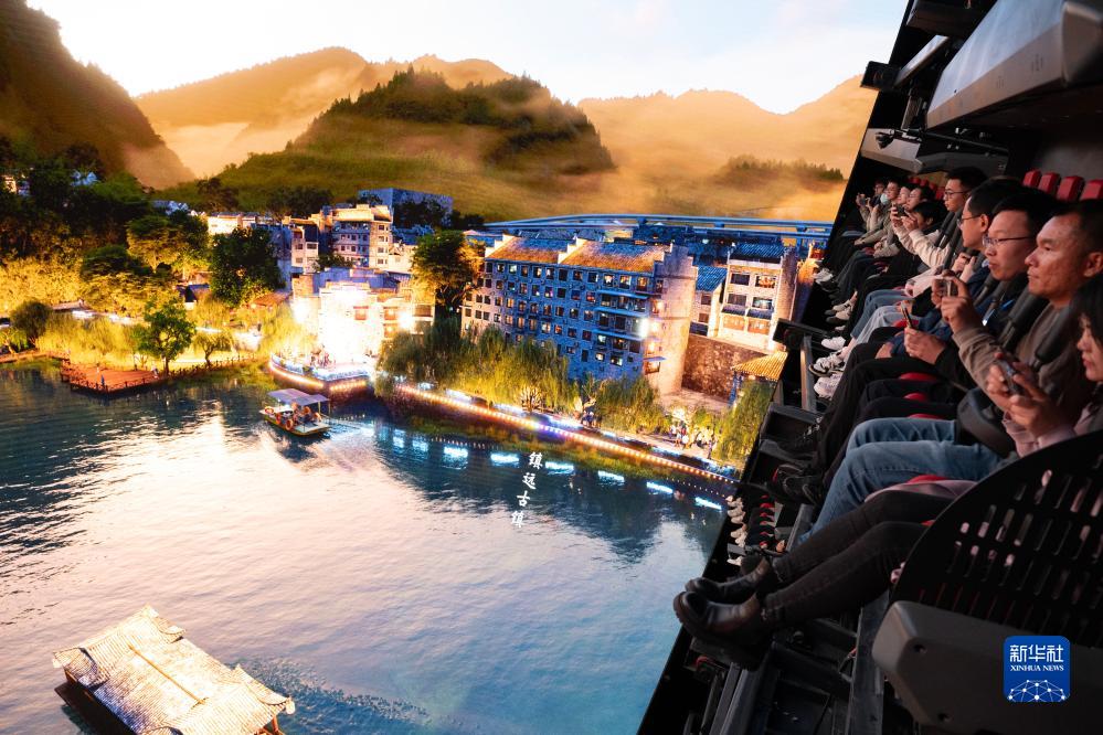 10月23日,觀眾在“紅飄帶”數(shù)字體驗館內(nèi)體驗“飛行影院”。