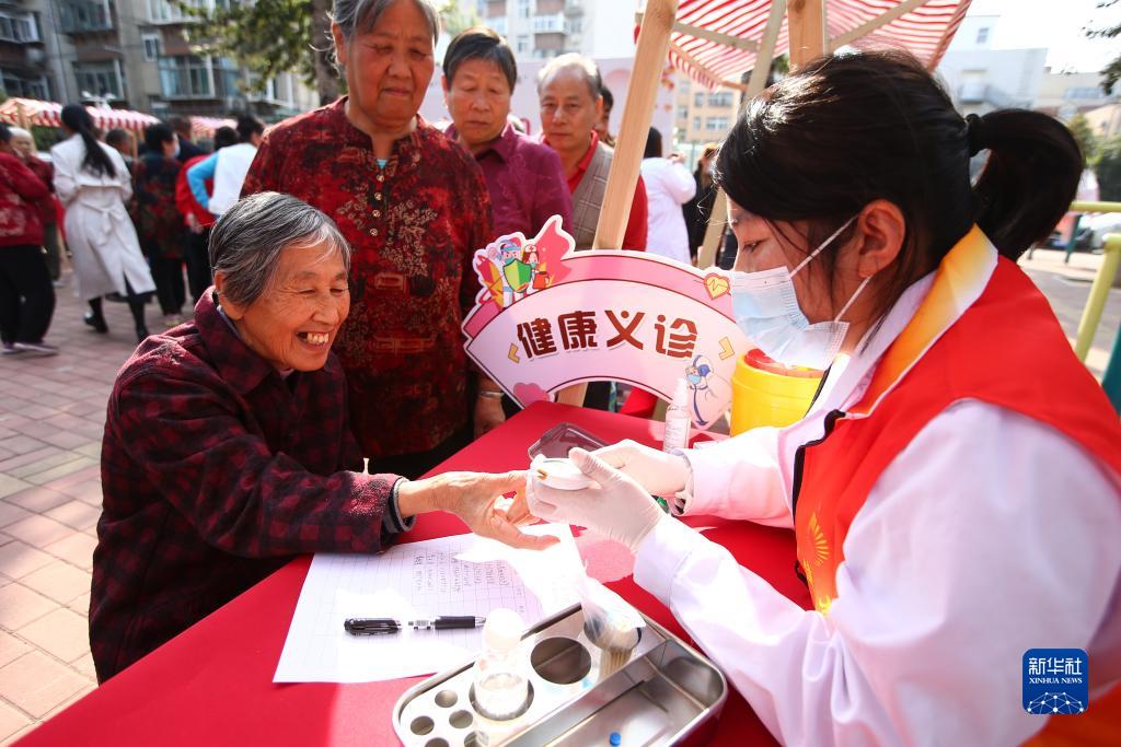 10月23日,在山東省濟南市洪家樓街道洪樓廣場社區(qū),志愿者為老年人開展健康義診。