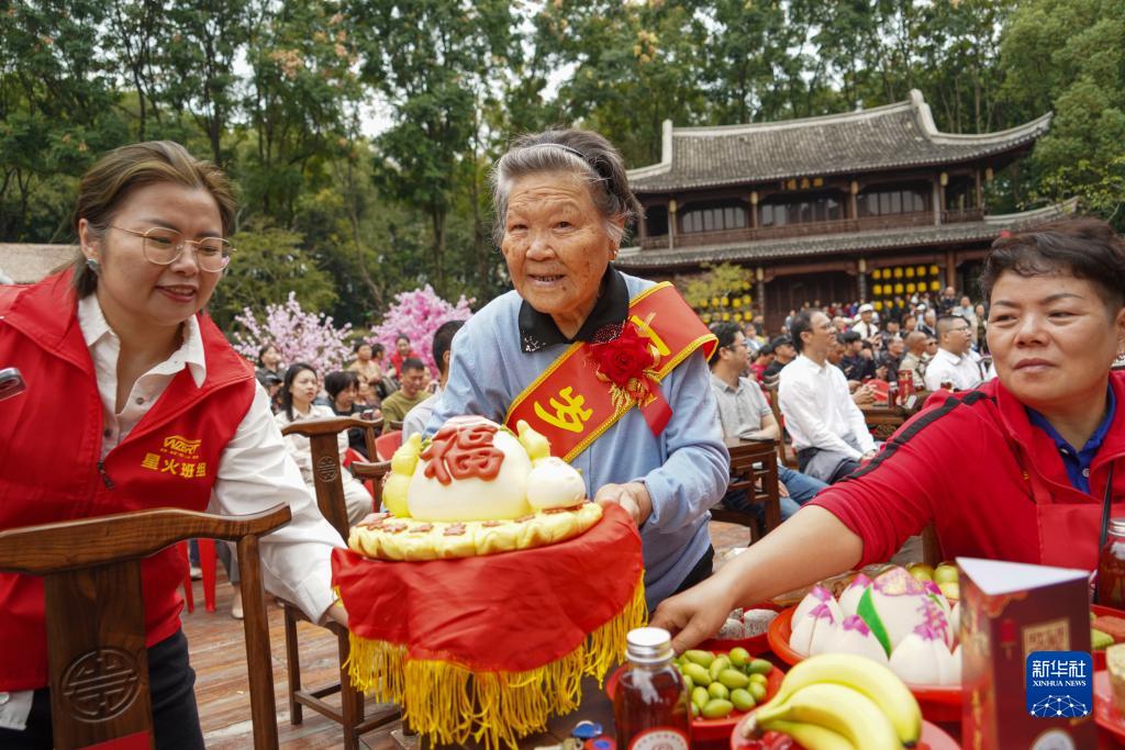 10月23日,在浙江省溫州市鹿城區(qū)九山書會(huì),志愿者為老壽星送上壽桃。