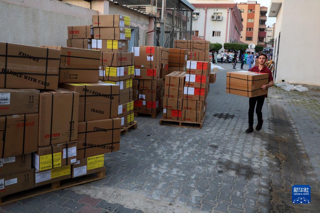 10月23日,在加沙地帶南部城市汗尤尼斯,一名工作人員搬運救援物資。