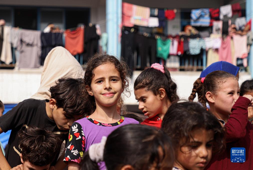 這是10月23日在加沙地帶南部聯合國近東巴勒斯坦難民救濟和工程處一所附屬學校內拍攝的流離失所的兒童。