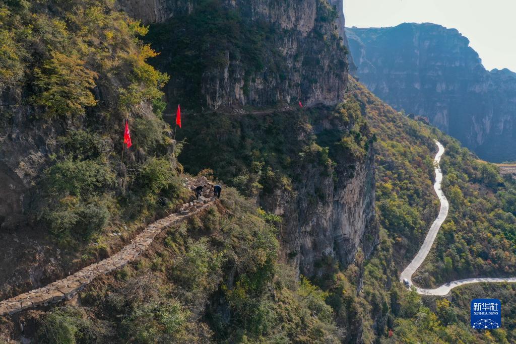 村民在太行山上修路(10月18日攝,無人機(jī)照片)。