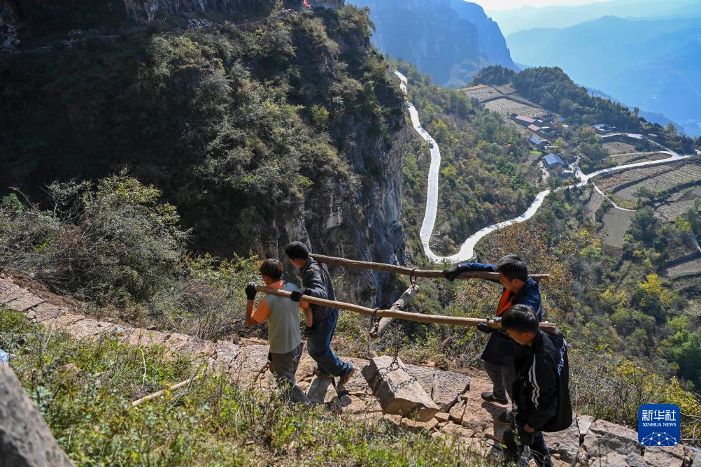 在壺關縣大峽谷鎮青龍峽村,村民在山間搬運石塊(10月17日攝)。