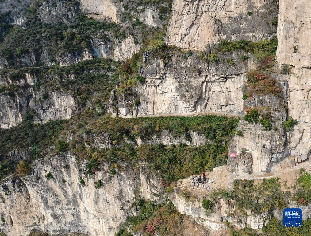 在壺關縣大峽谷鎮青龍峽村,村民們在山上修路(10月17日攝,無人機照片)。