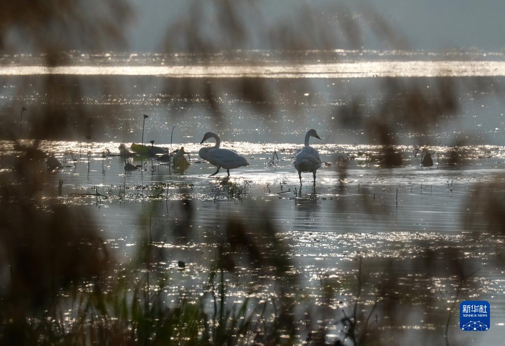 10月24日,大天鵝在三門峽市天鵝湖國家城市濕地公園內棲息。