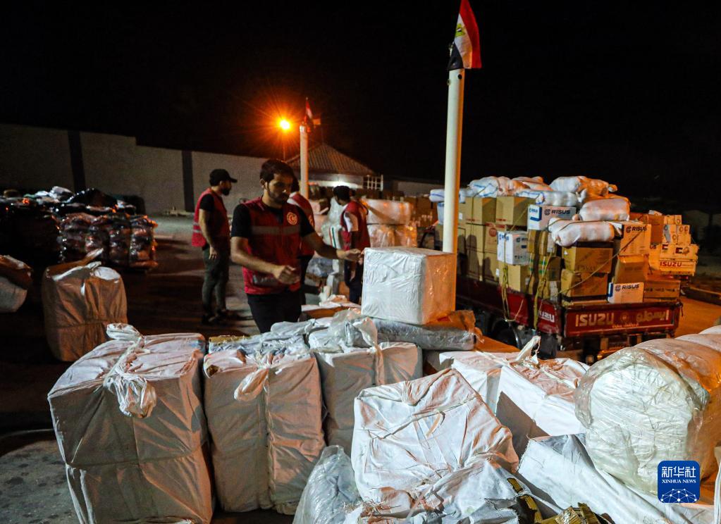 10月23日,在埃及阿里什市一處倉庫,埃及紅新月會的工作人員搬運(yùn)救援物資。