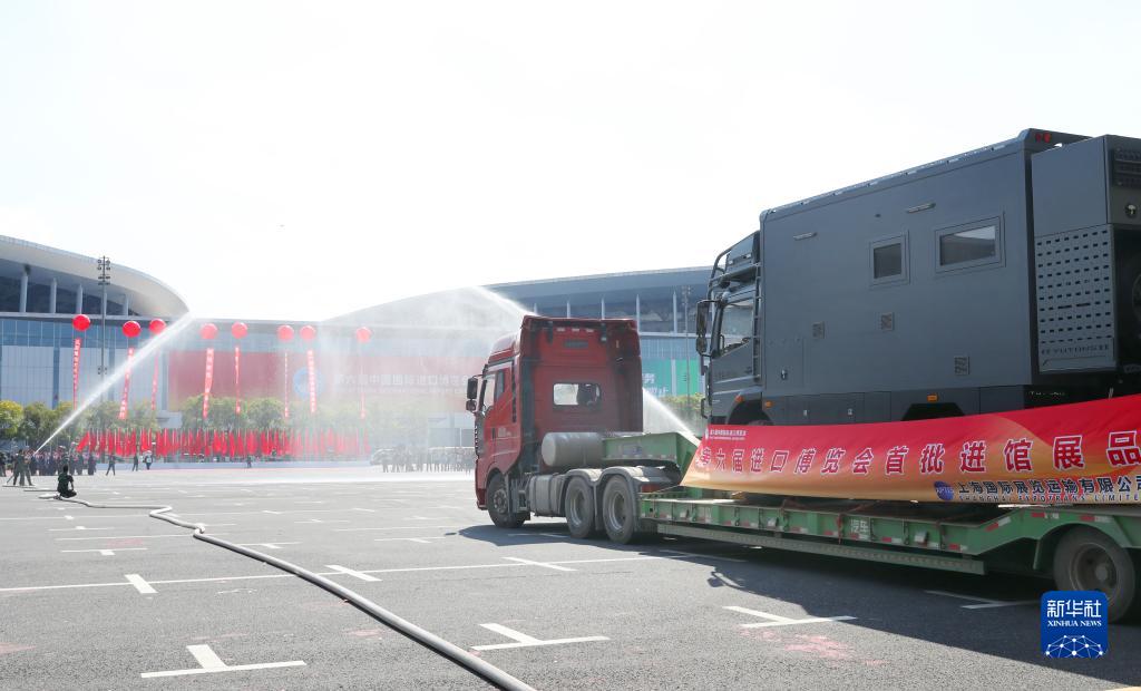 10月24日,第六屆進博會首批展品進館儀式在國家會展中心(上海)舉行,這是裝載首批進館展品的卡車在儀式上駛過歡迎水門。