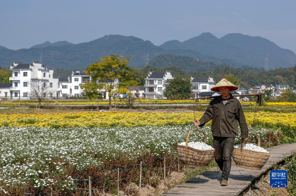 10月24日,安徽省黃山市休寧縣鹽鋪村農(nóng)民挑運剛收獲的徽州貢菊。