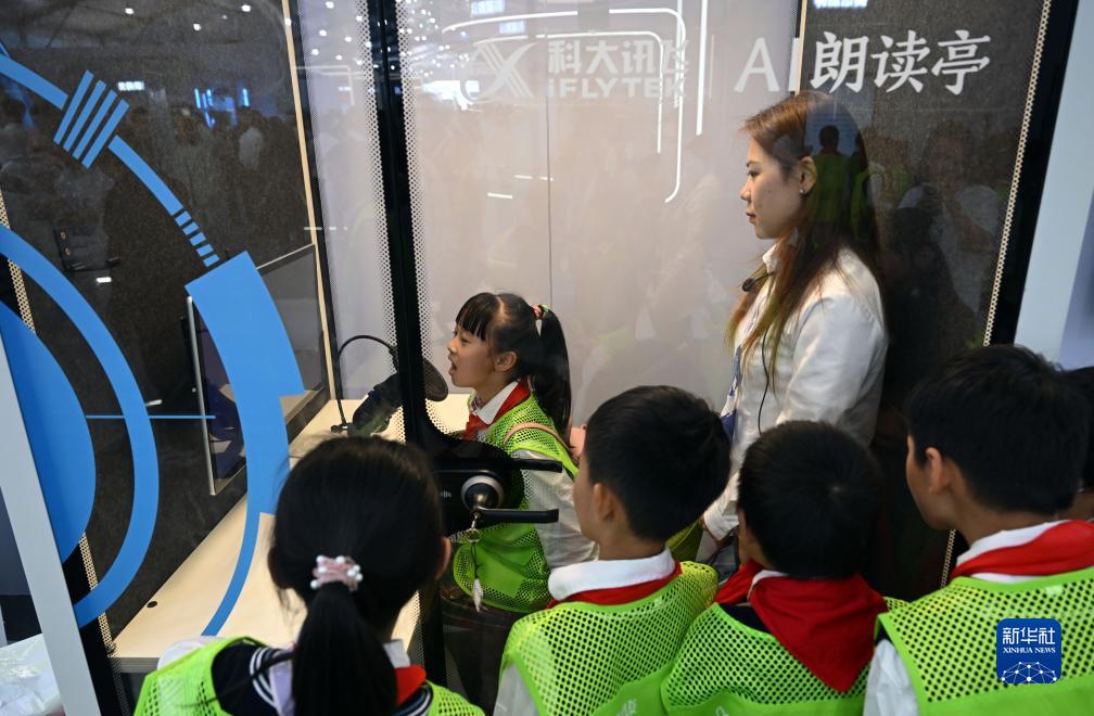10月24日,小朋友們在第六屆世界聲博會上參觀體驗AI朗讀。
