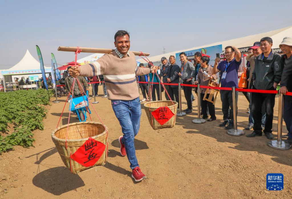 10月23日,在山東省滕州市大塢鎮(zhèn)展會(huì)現(xiàn)場(chǎng),一名國外參展商參加馬鈴薯豐收慶祝活動(dòng)。