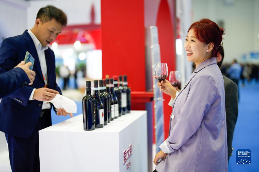 10月24日,參觀者在2023中國國際地理標志品牌合作大會上品嘗紅酒。