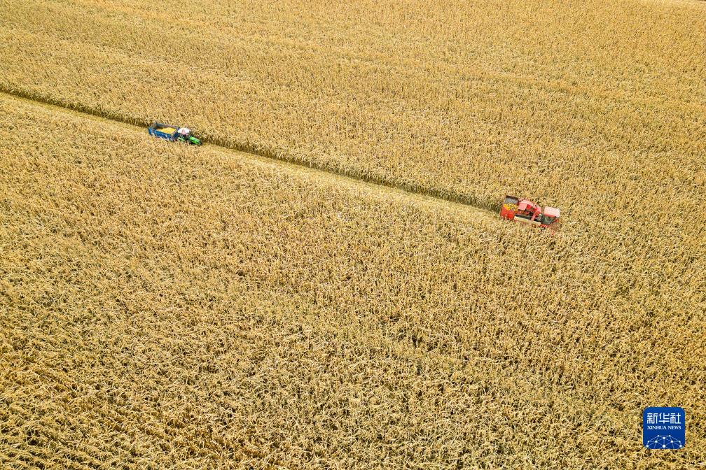 10月18日,收割機在黑龍江省綏化市北林區張維鎮潤地農業種植合作社的一處玉米地收獲玉米(無人機照片)。