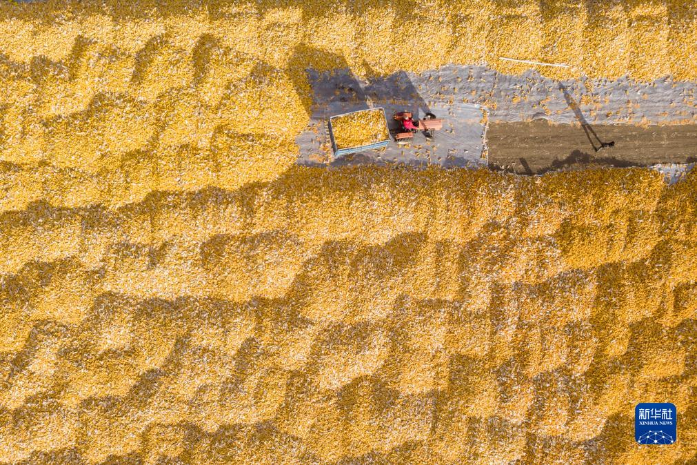 10月19日,在黑龍江省肇東市五里明鎮(zhèn)東升村,農(nóng)民把收獲的玉米運到當?shù)剞r(nóng)業(yè)合作社指定的地點進行晾曬(無人機照片)。