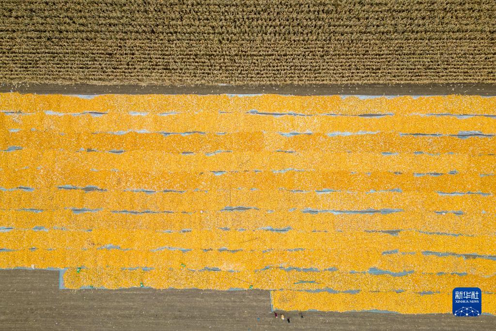 10月18日,在黑龍江省綏化市北林區張維鎮潤地農業種植合作社的一處玉米晾曬場,村民整理收獲的玉米(無人機照片)。
