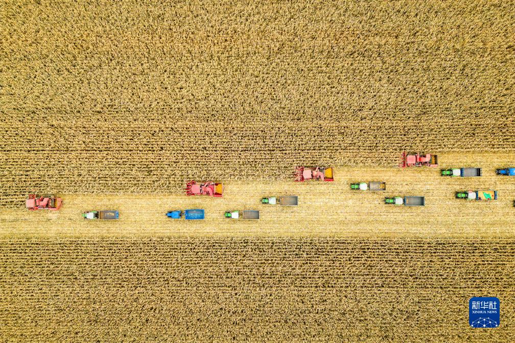 10月18日,收割機在黑龍江省綏化市北林區張維鎮潤地農業種植合作社的一處玉米地收獲玉米(無人機照片)。