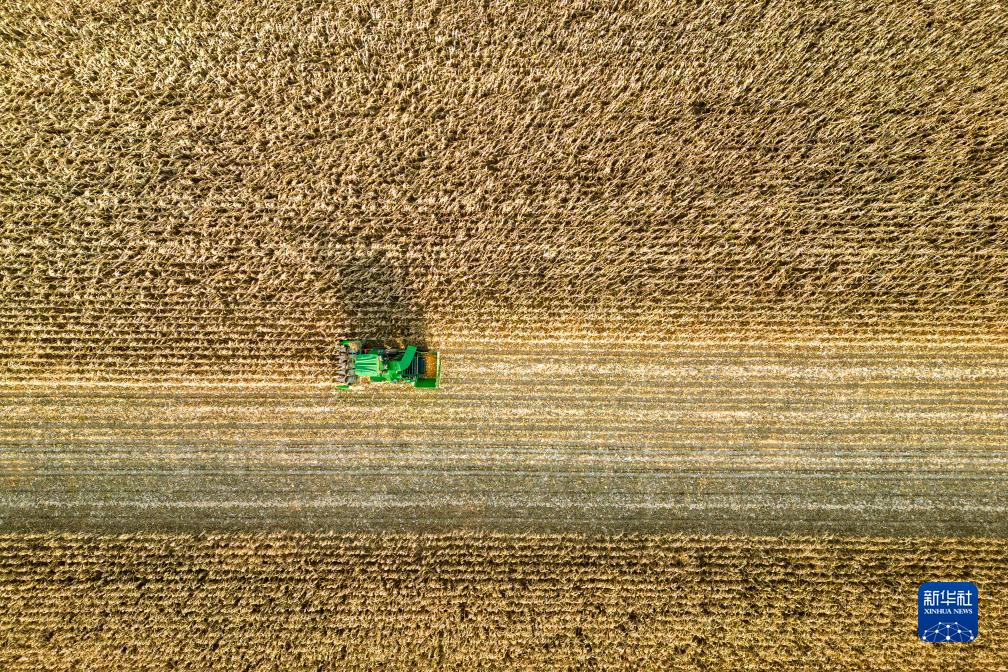 10月19日,收割機(jī)在齊齊哈爾市甘南縣中興鄉(xiāng)綠化村的一處玉米地收獲玉米(無人機(jī)照片)。