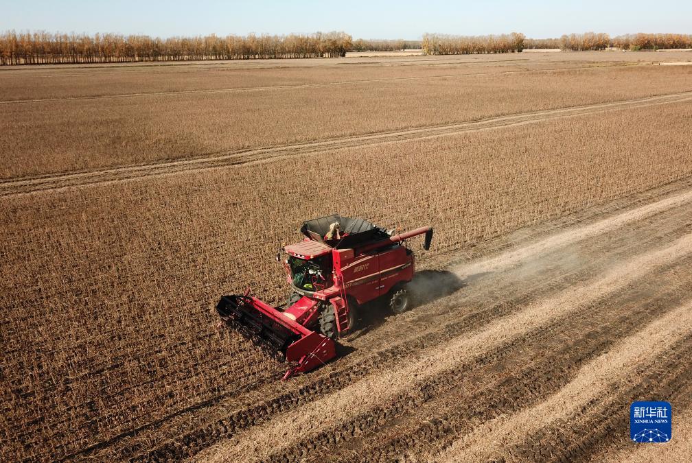 這是10月11日拍攝的收割機在黑龍江省富錦市收獲大豆(無人機照片)。