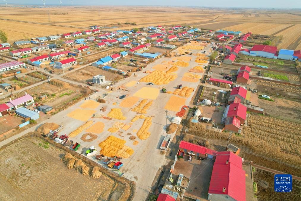 10月24日,在黑龍江省富錦市大榆樹鎮邵店村,農民把收獲的糧食運到空地上晾曬(無人機照片)。