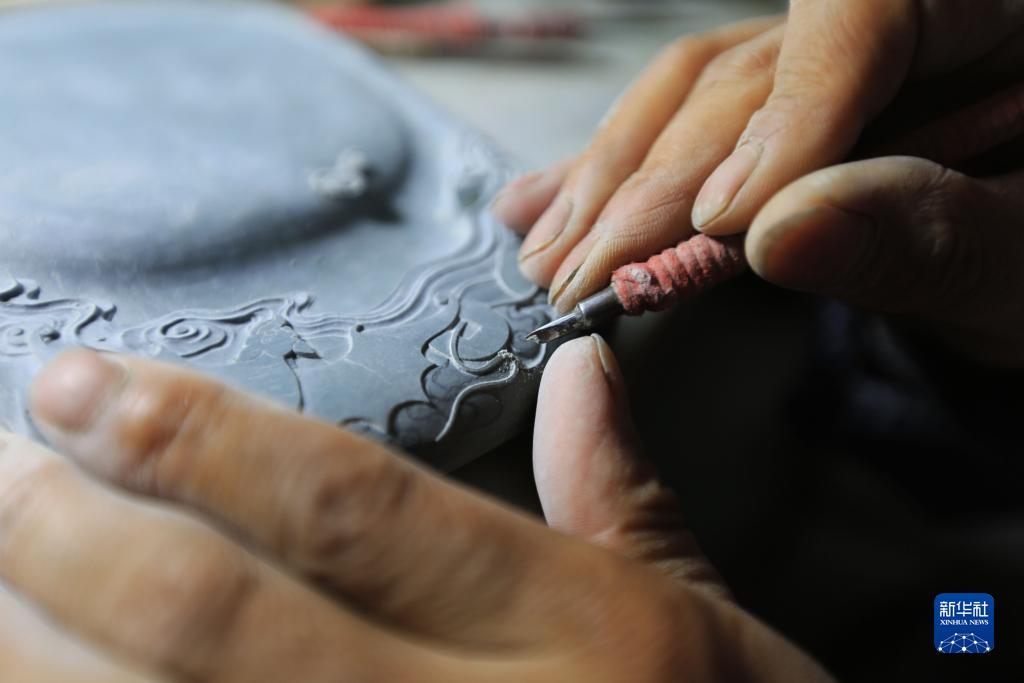 10月24日,藝人在甘肅省定西市臨洮縣洮硯藝術館雕刻制作洮硯。