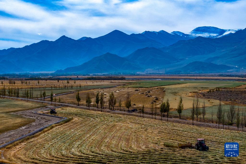10月24日,村民駕駛農(nóng)機在拉薩市林周縣強嘎鄉(xiāng)曲嘎強村收割牧草(無人機照片)。