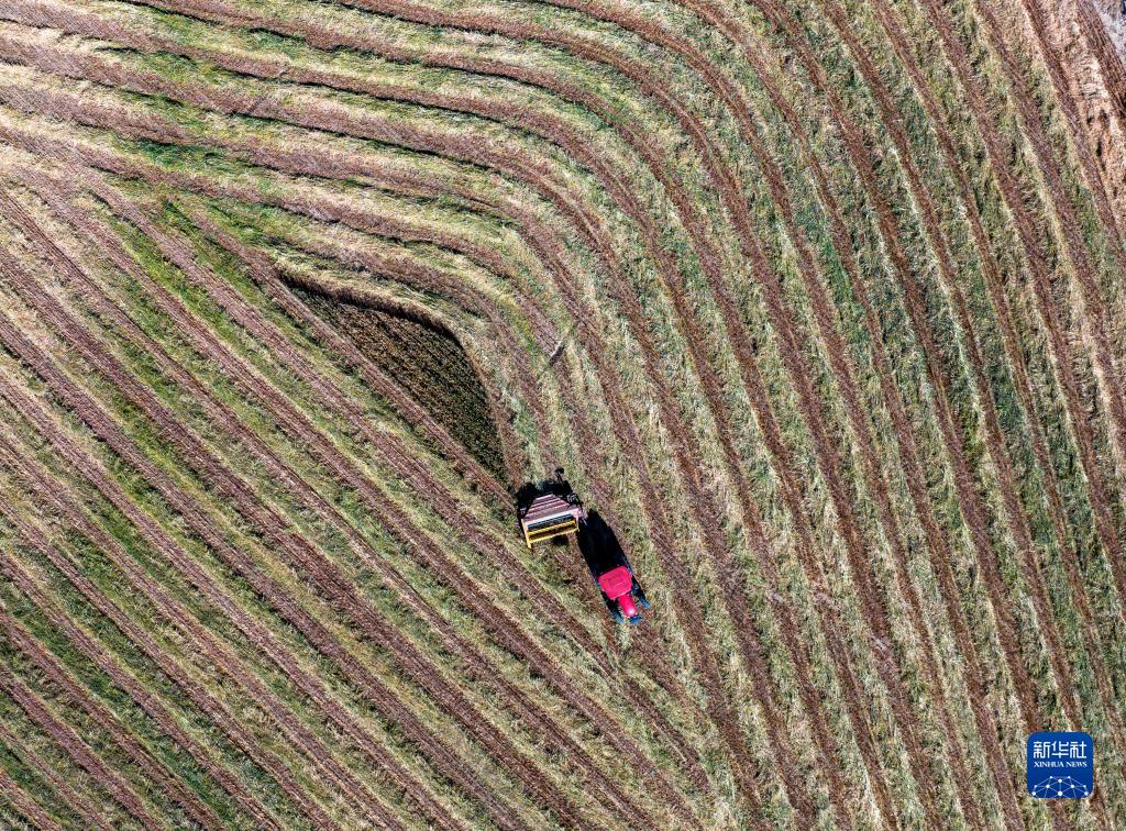 10月24日,村民駕駛農(nóng)機(jī)在拉薩市林周縣強(qiáng)嘎鄉(xiāng)曲嘎強(qiáng)村收割牧草(無(wú)人機(jī)照片)。