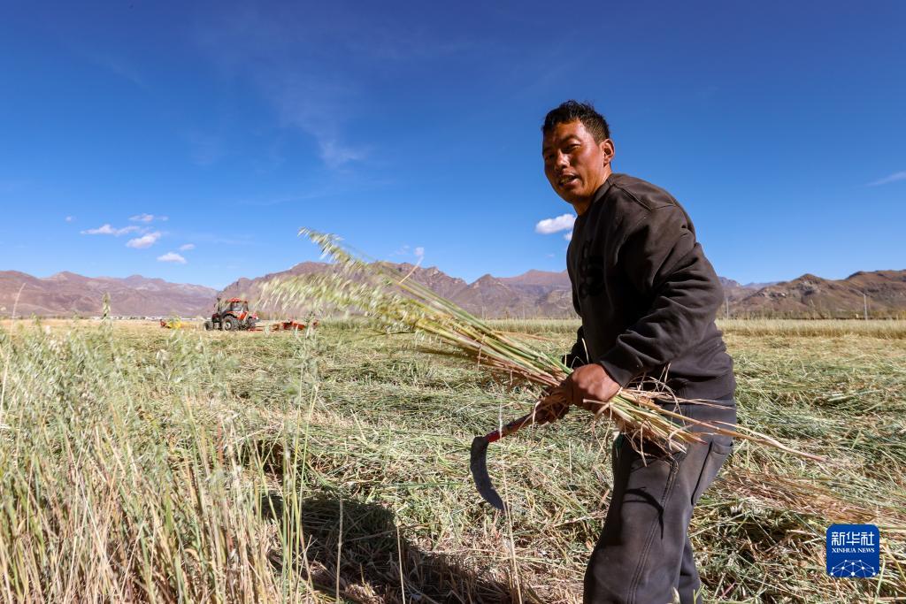 10月24日,拉薩市林周縣強(qiáng)嘎鄉(xiāng)曲嘎強(qiáng)村村民阿旺旦增在自家田壟邊收割牧草。