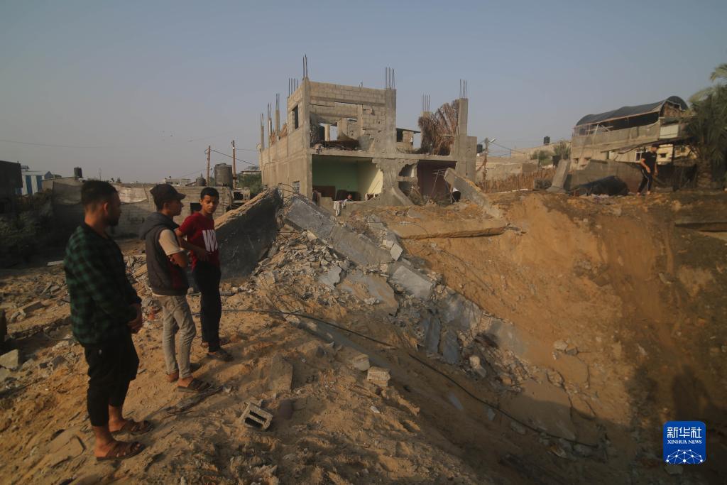 10月24日,在加沙地帶南部城市拉法,人們站在遭以色列襲擊的建筑廢墟旁。